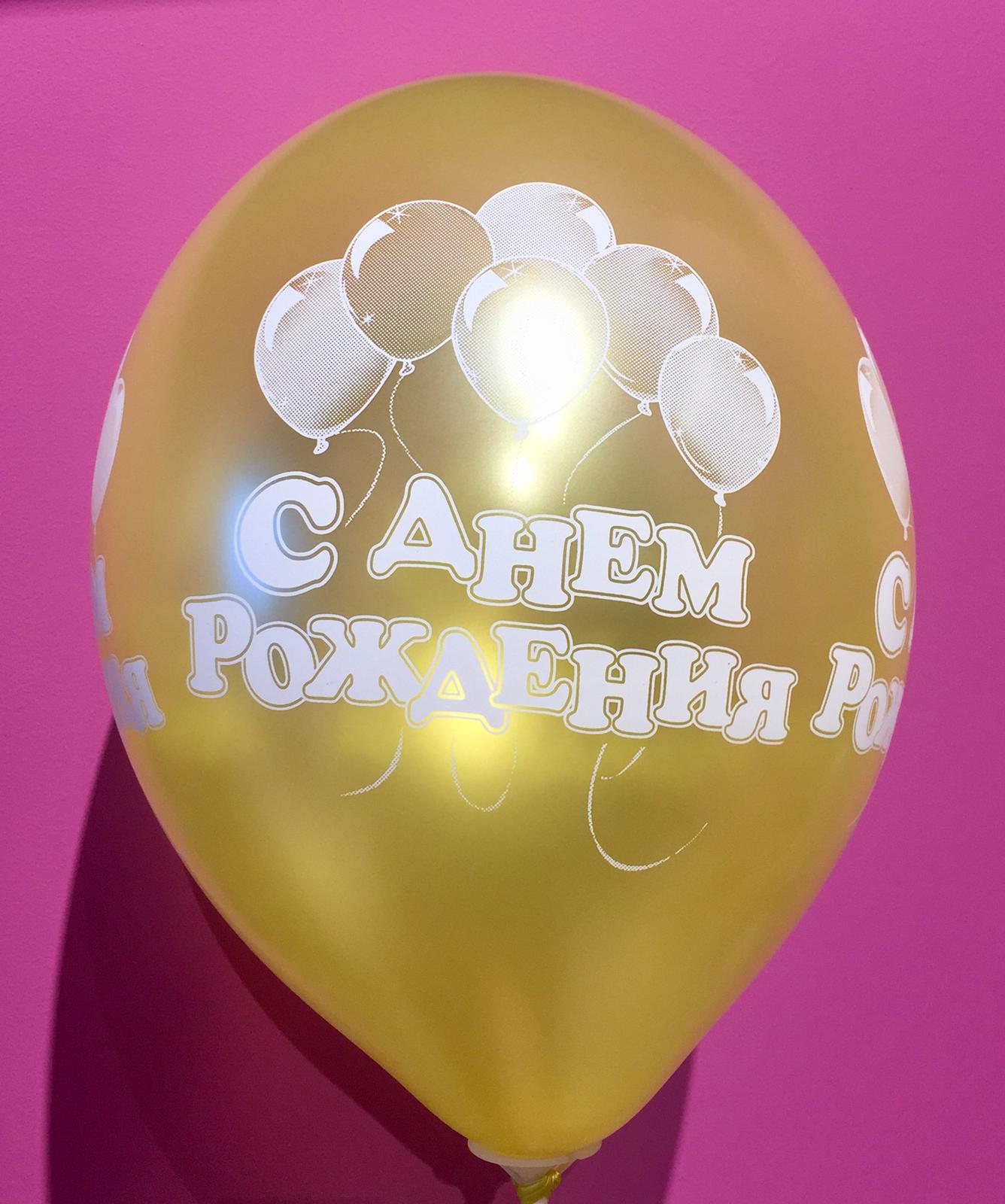 Lateksa balons pildīts ar hēliju ar uzrakstu “С Днем Рождения”.