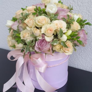 Kompozīcija salikta elegantā kastītē, oāzē un apsieta ar lentīti.