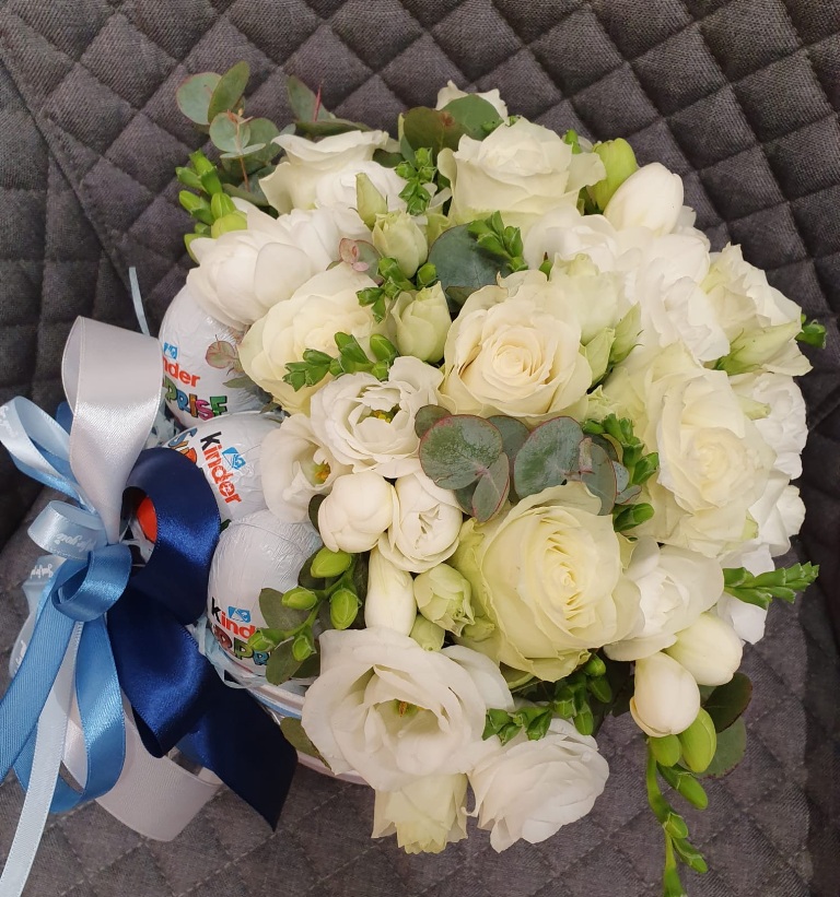 Kompozīcijā ietilpst rozes, frēzijas, lizantes, eikalipta zaļumi un 5 kinder olas.