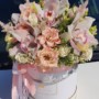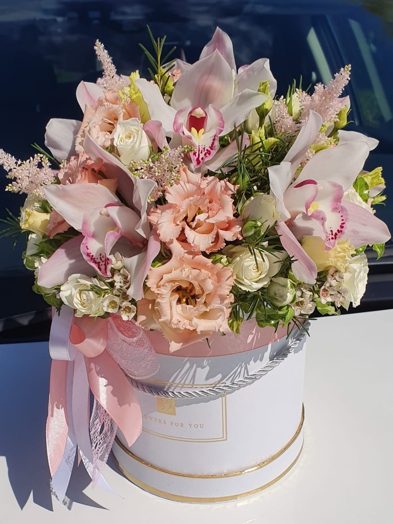 Kompozīcijā ietilpst orhidejas, lizantes, krūmrozes, astilbes, vaska ziedi un zaļumi.
