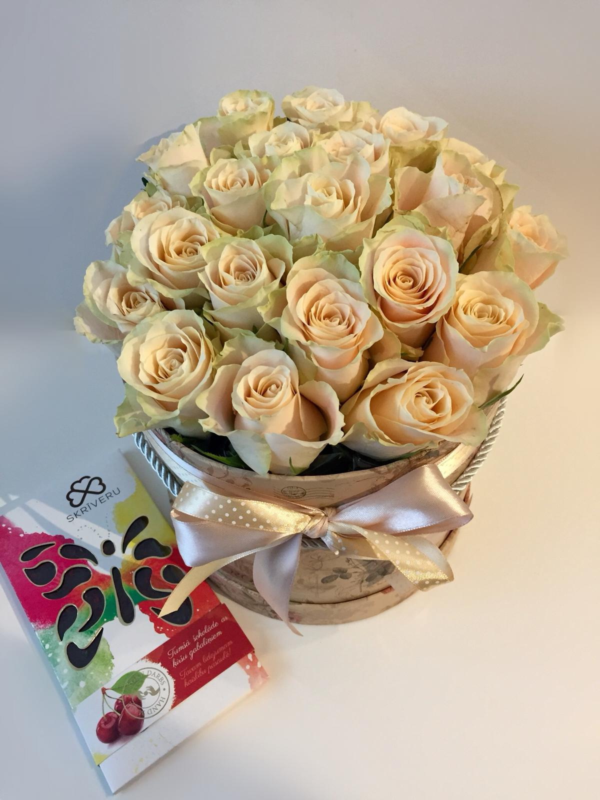 Ziedu kastīte oāze ar rozēm (19 gab.) – apaļā formā ar augstām malām.
