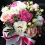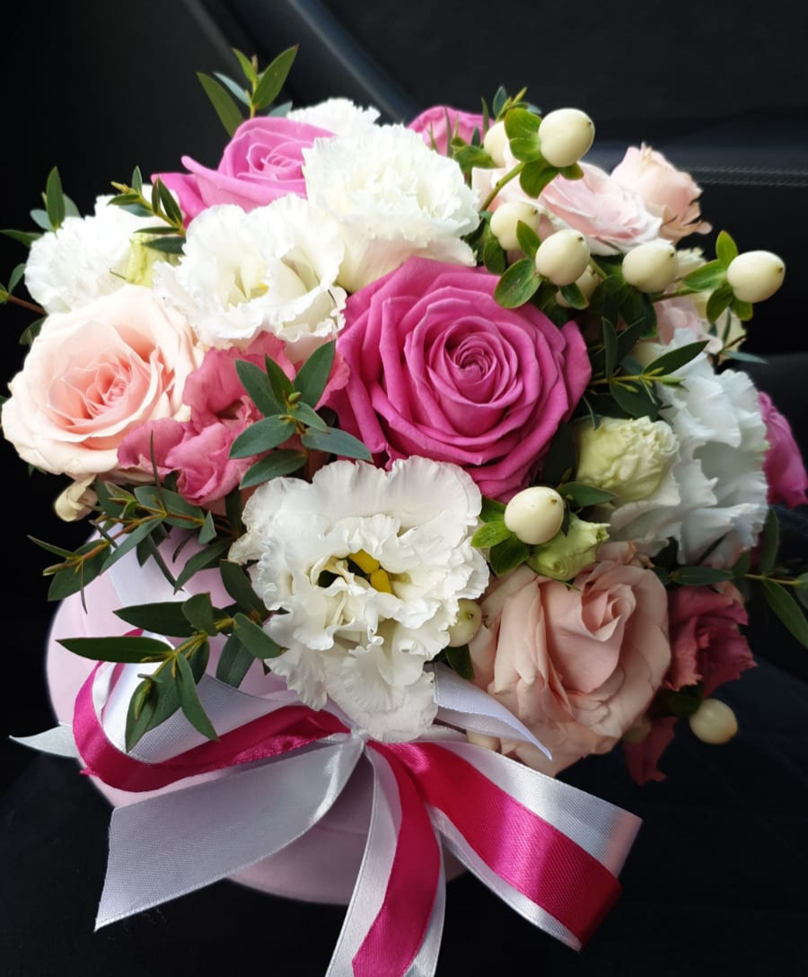 Kompozīcijā ietilpst rozes, krūmrozes, lizantes, hipericum odziņas un zaļumi.