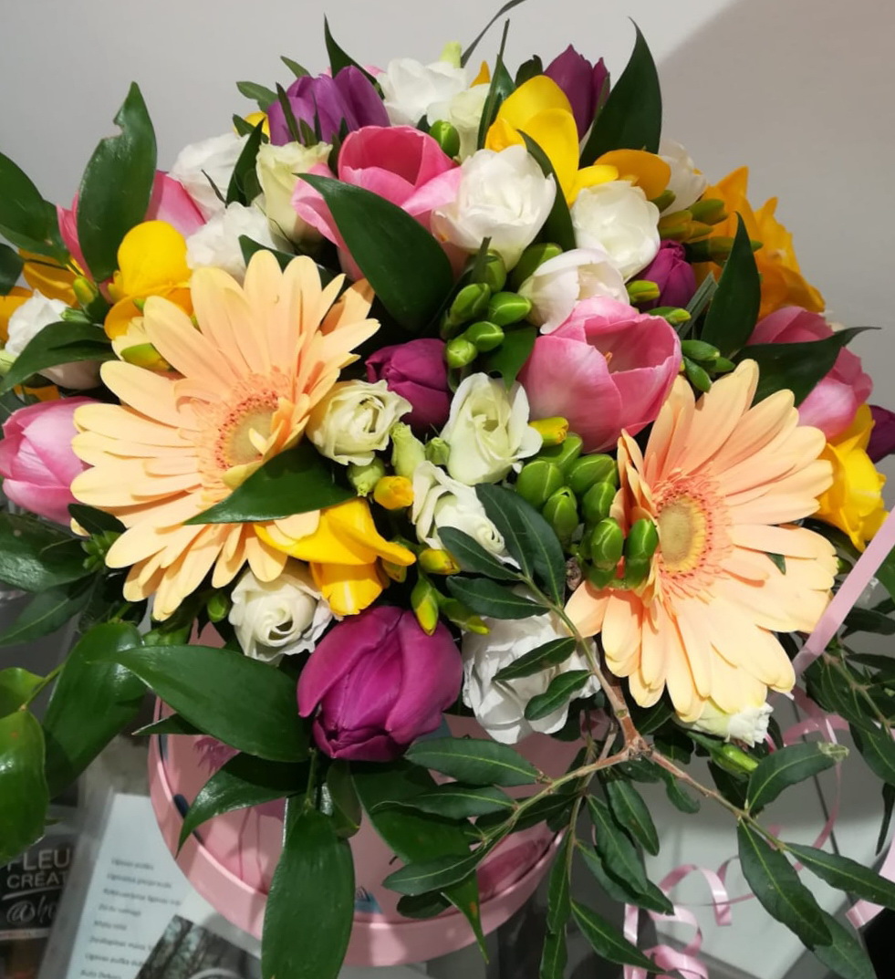 Kompozīcijā ietilpst gerberi, lizantes, tulpes, frēzijas un zaļumi.