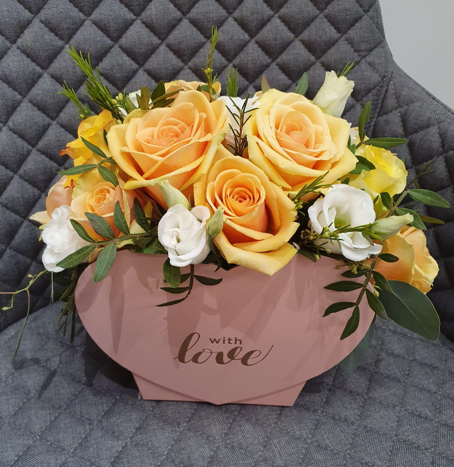 Kompozīcijā ietilpst rozes, lizantes un zaļumi.