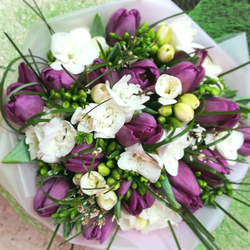 Pušķis, kas sastāvā ir baltās frēzijas, violētas tulpes un zaļumi.