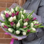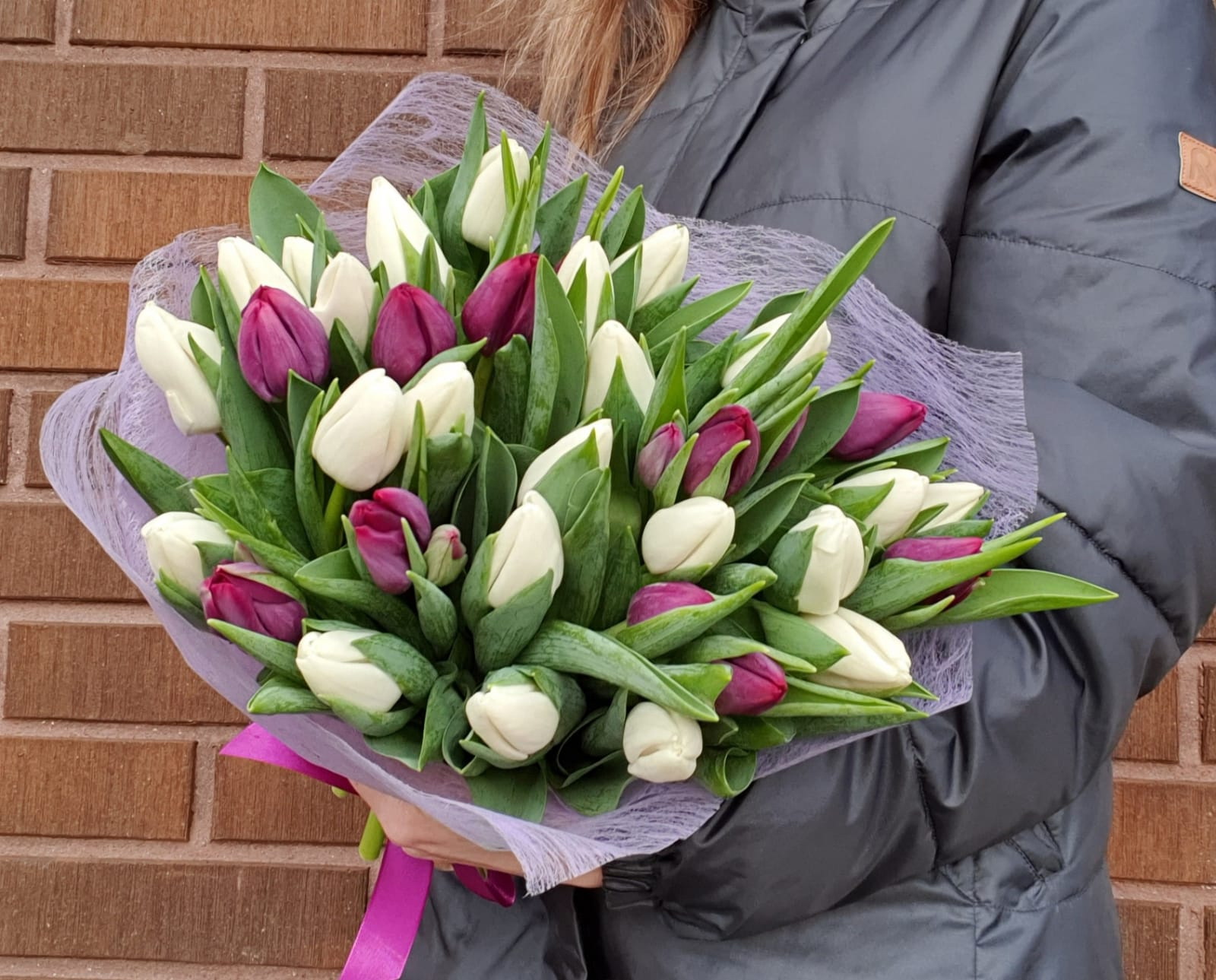 Pušķis, kas sastāvā ir baltās un violētas tulpes.