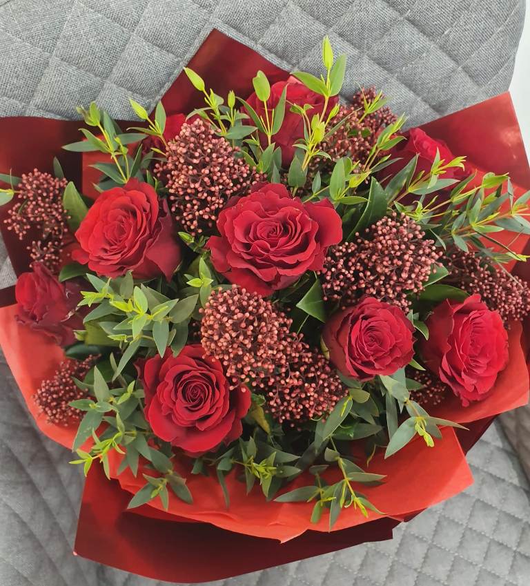 Pušķis, kas sastāvā ir rozes, skimija un eikalipts.