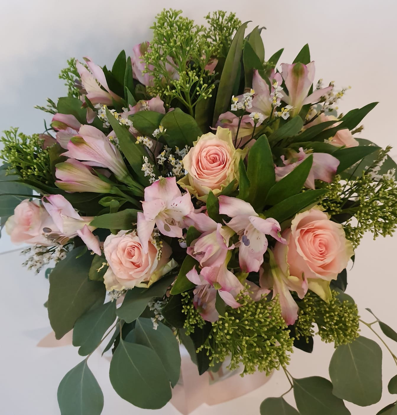 Vidēja izmēra pušķis, kas sastāvā ir rozes, alstromērijas, skimija, limonijas un zaļumi.