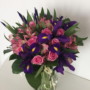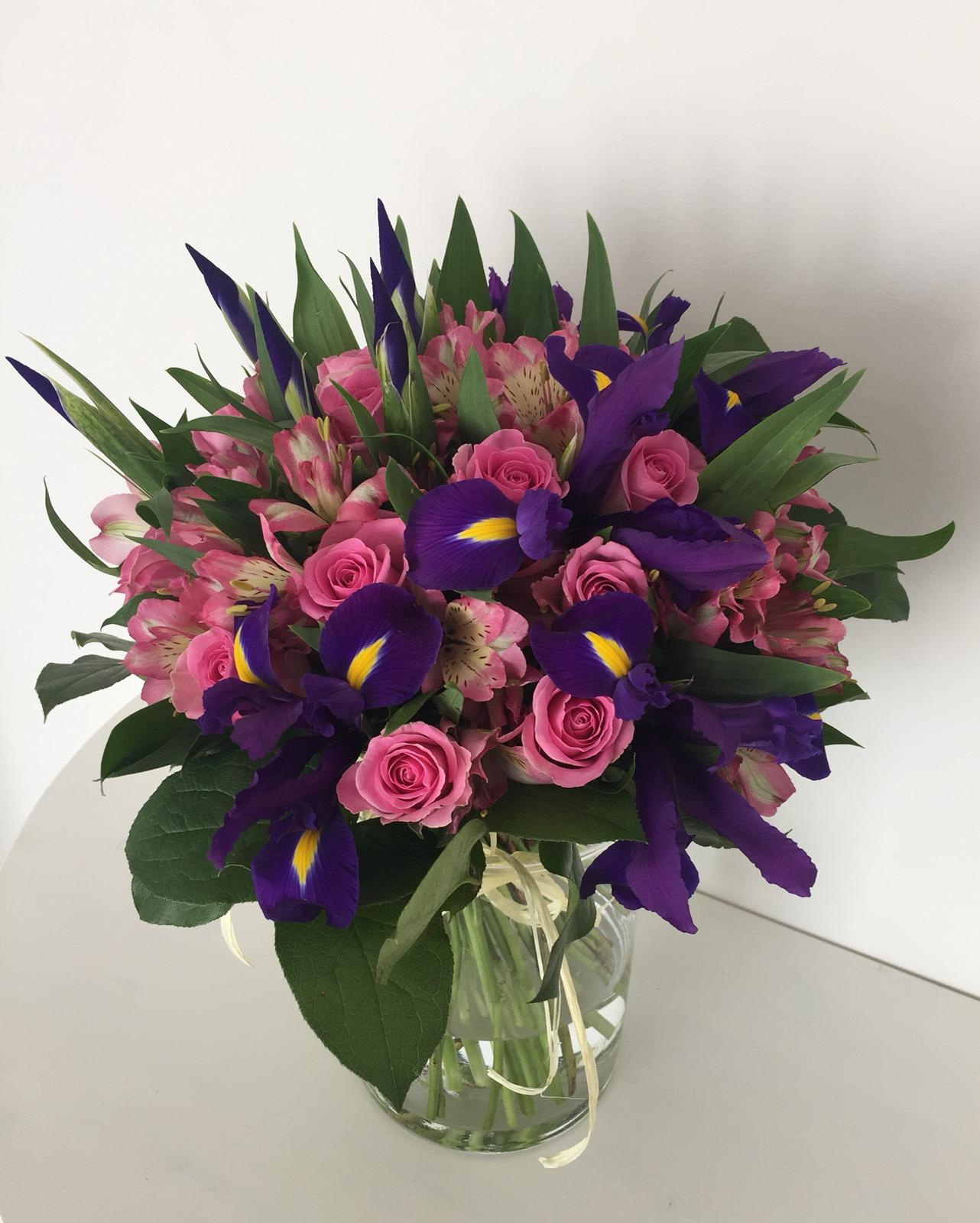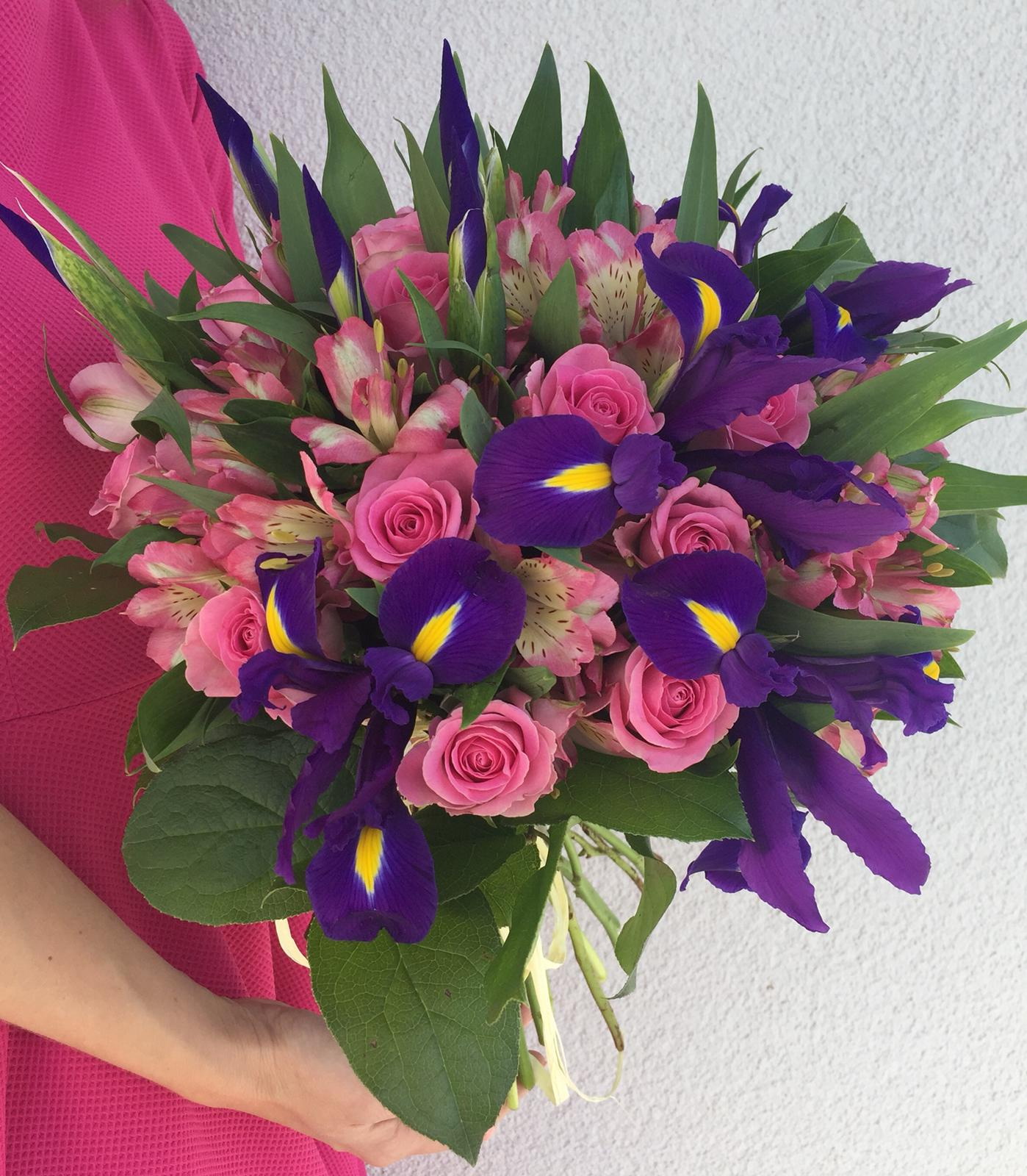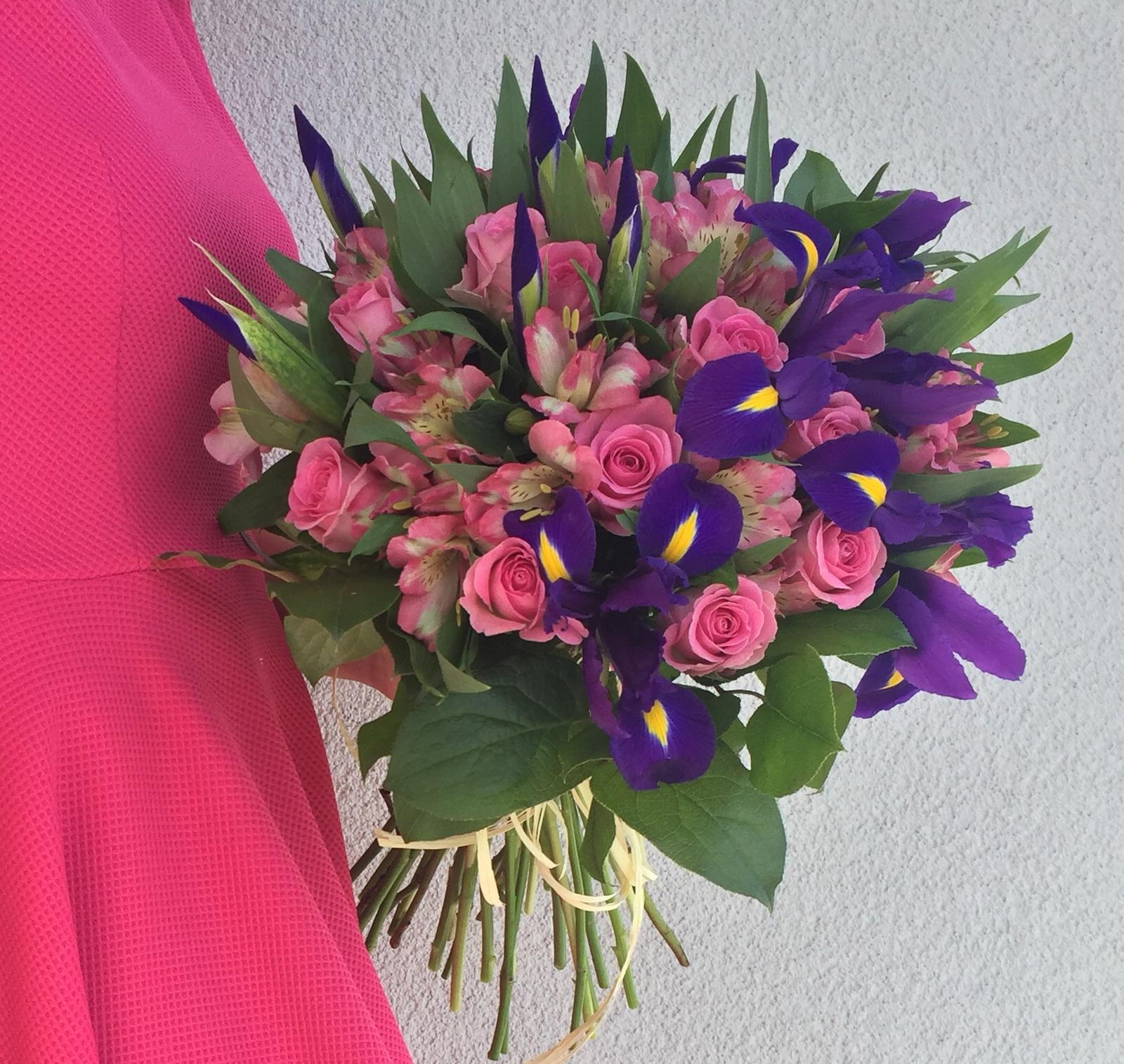 Pušķis, kas sastāvā ir īrisi, rozes un alstromerijas, kam gaumīgi pievienoti zaļumi.