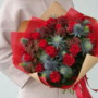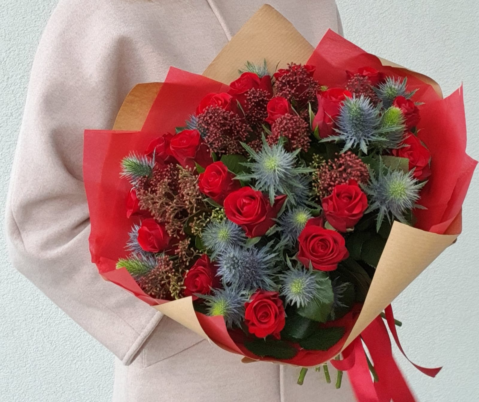 Pušķis, kas sastāvā ir sarkanas rozes un ekzotiskie augi – skimija un eringium.