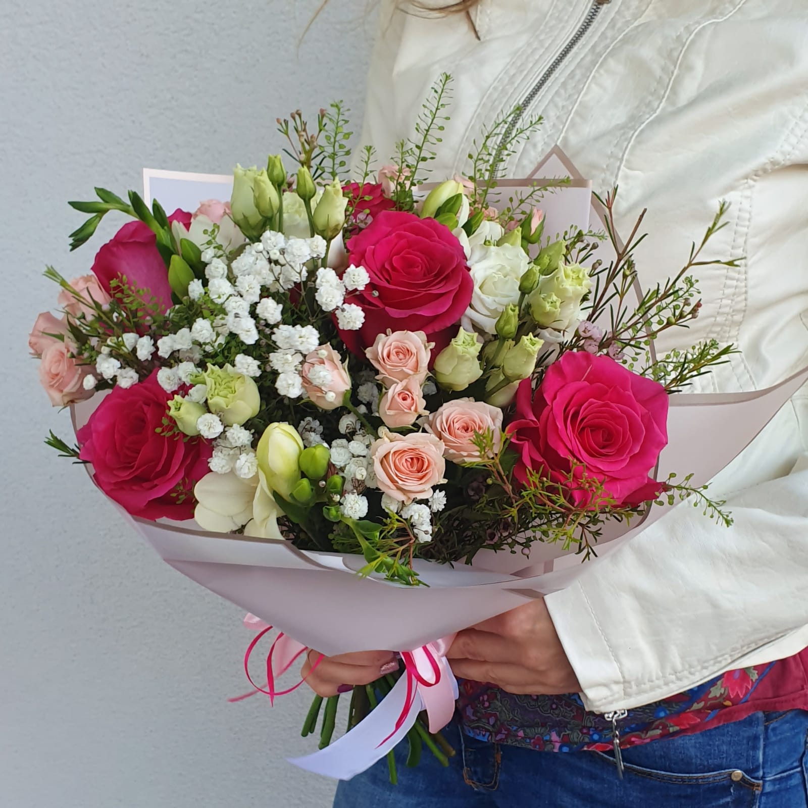 Pušķis, kas sastāvā ir rozes, krūmrozes, frēzijas, lizantes, ģipsofila, vaska ziedi un zaļumi.