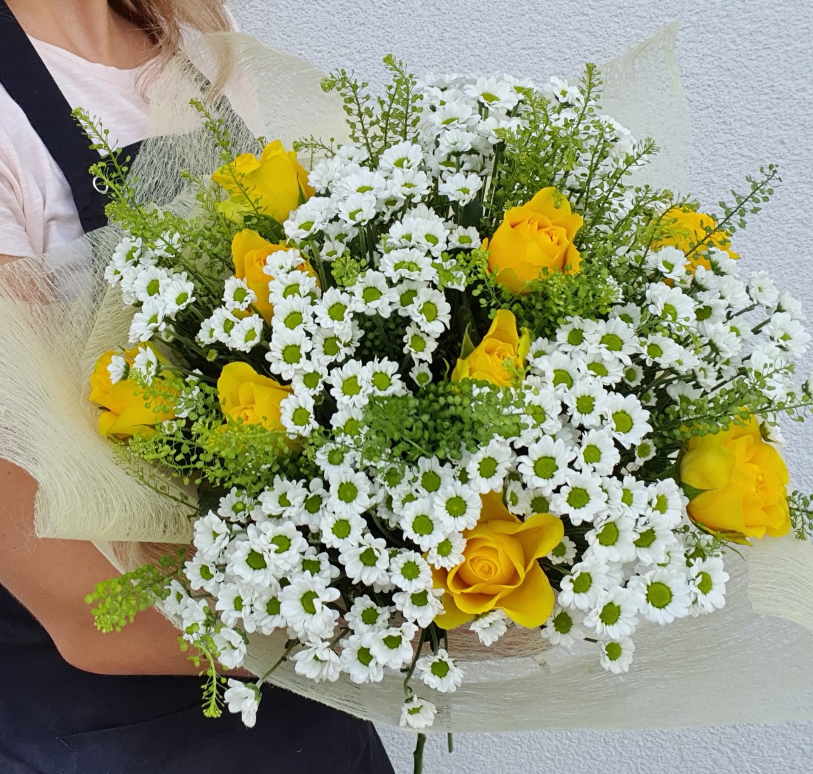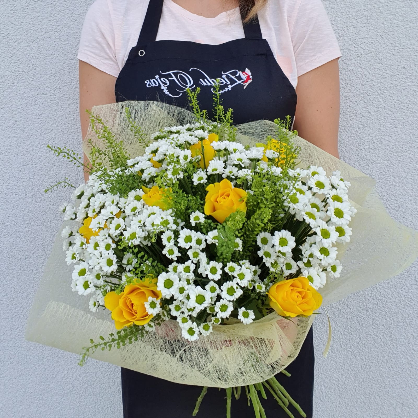 Pušķis ir vidēja blīvuma, kā arī tas ir ietīts dizaina sietiņā un apsiets ar lentīti.