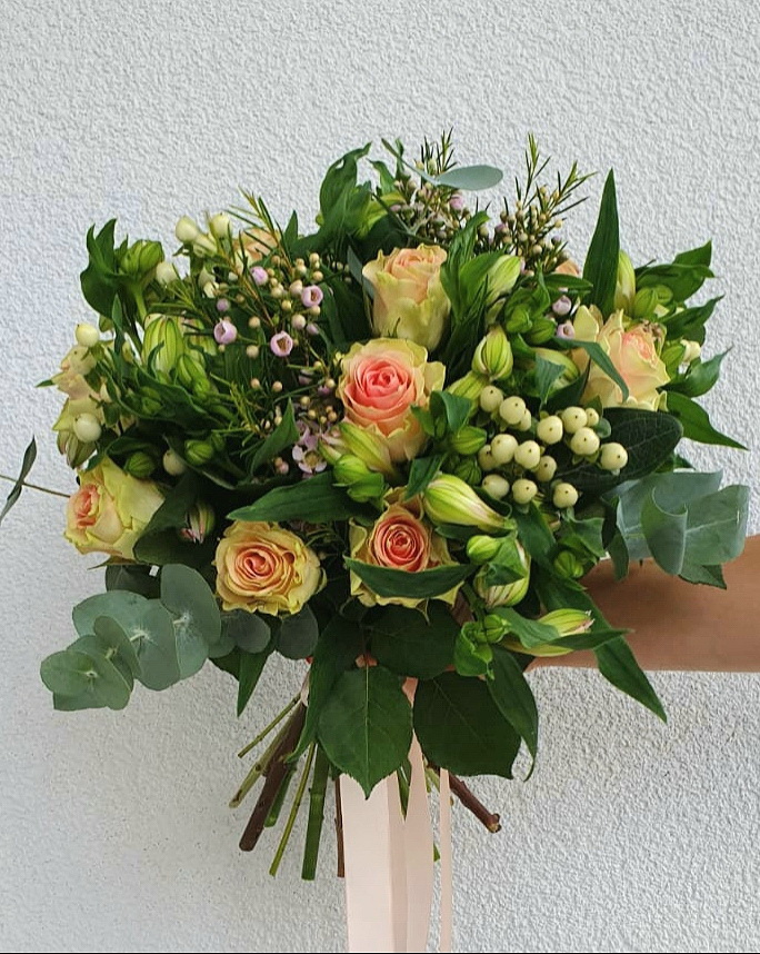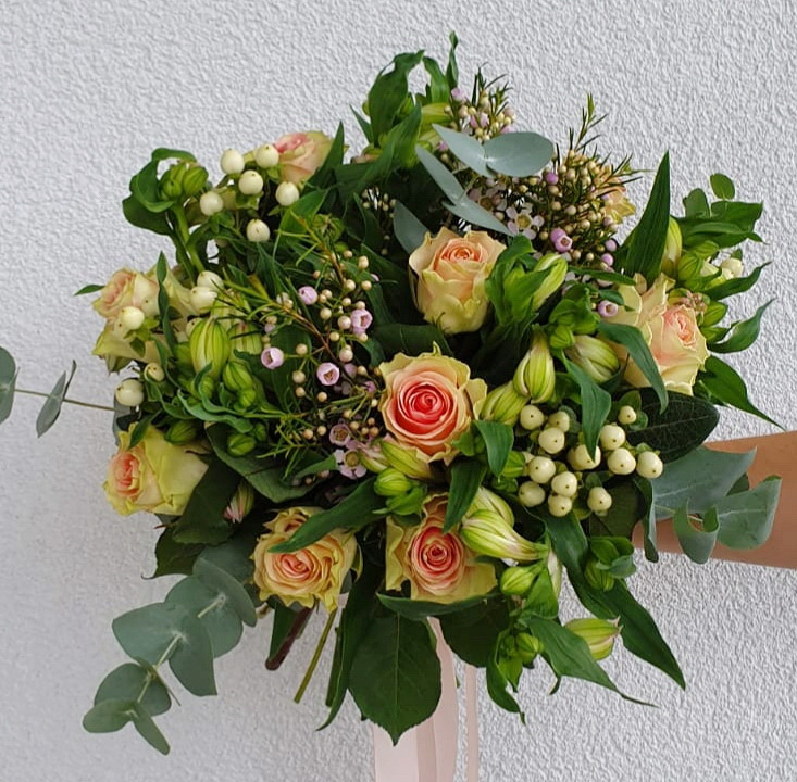 Vidēja izmēra pušķis, kas sastāvā ir rozes, hipericum odziņas, vaska ziedi, alstromērijas, kam gaumīgi pievienoti zaļumi.