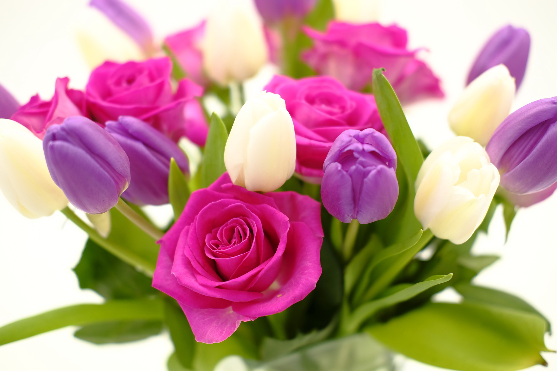 Vidēja izmēra pušķis, kas sastāvā ir rozes, violetas un baltas tulpes.