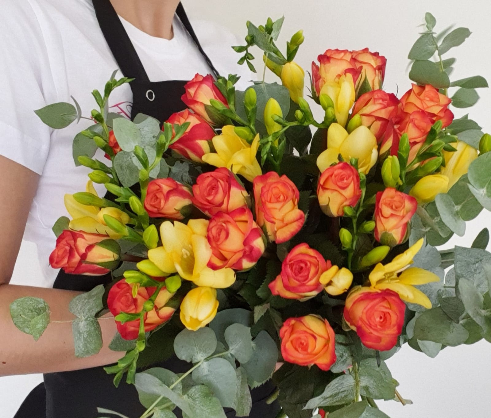 Vidēja izmēra pušķis, kas sastāvā ir smaržīgas frēzijas, rozes un eikalipta zaļumi.