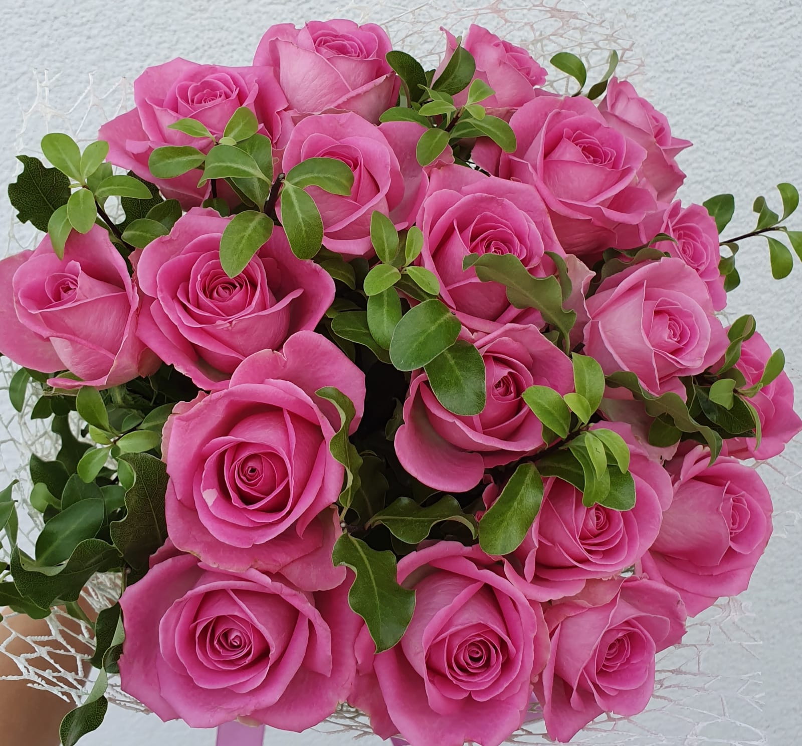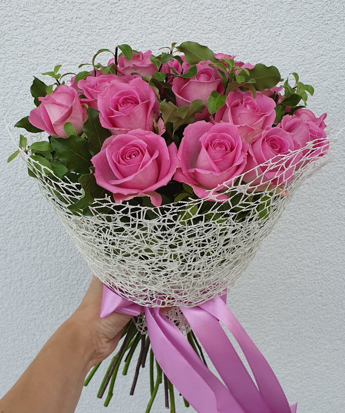 Pušķis ir vidēja blīvuma, kā arī tas ir ietīts dizaina sietiņā un apsiets ar lentīti.