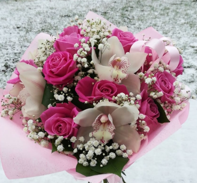 Pušķis, kas sastāvā ir rozes, orhidejas un ģipsofila.