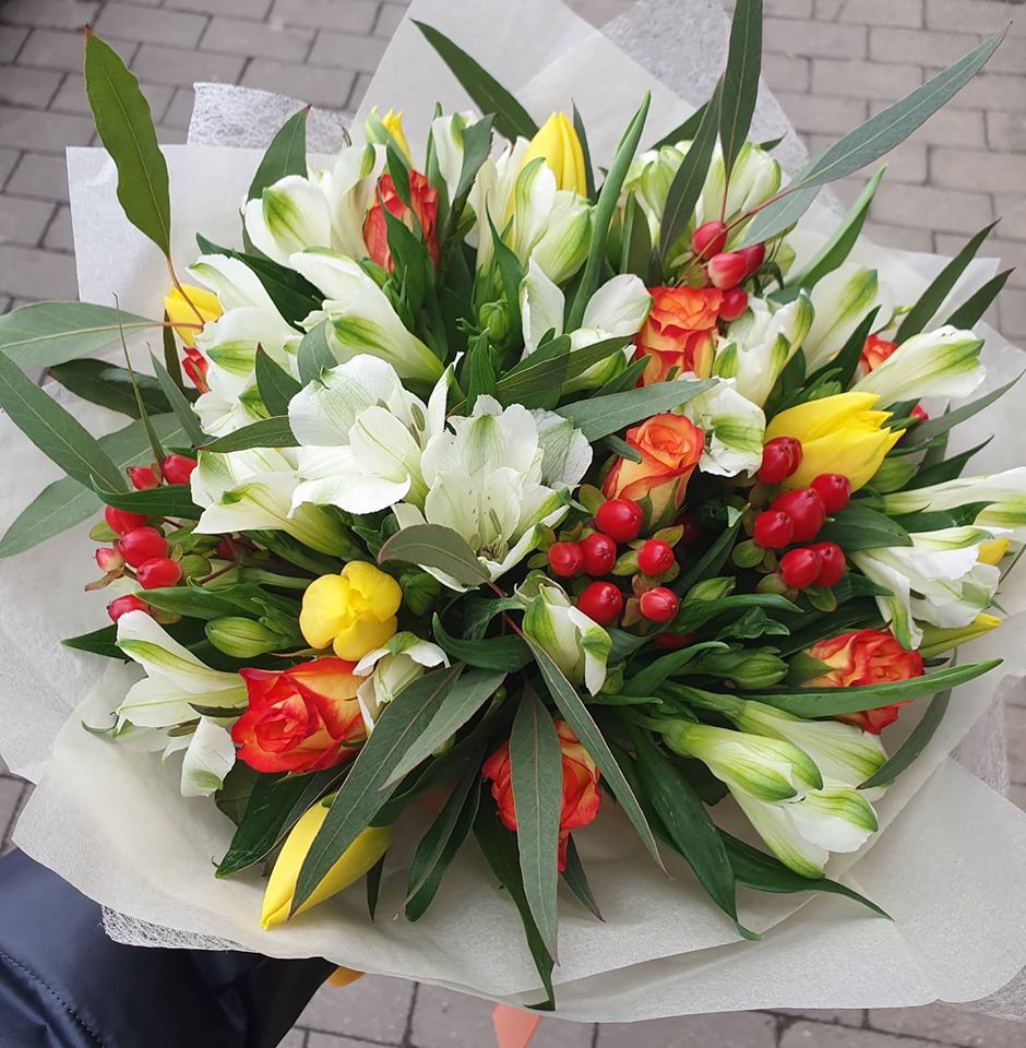 Pušķis, kas sastāvā ir alstromērijas, rozes, tulpes, hipericum odziņas un eikalipta zaļumi.