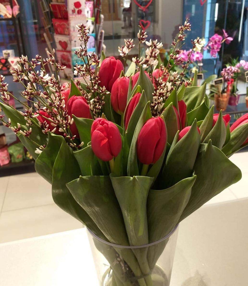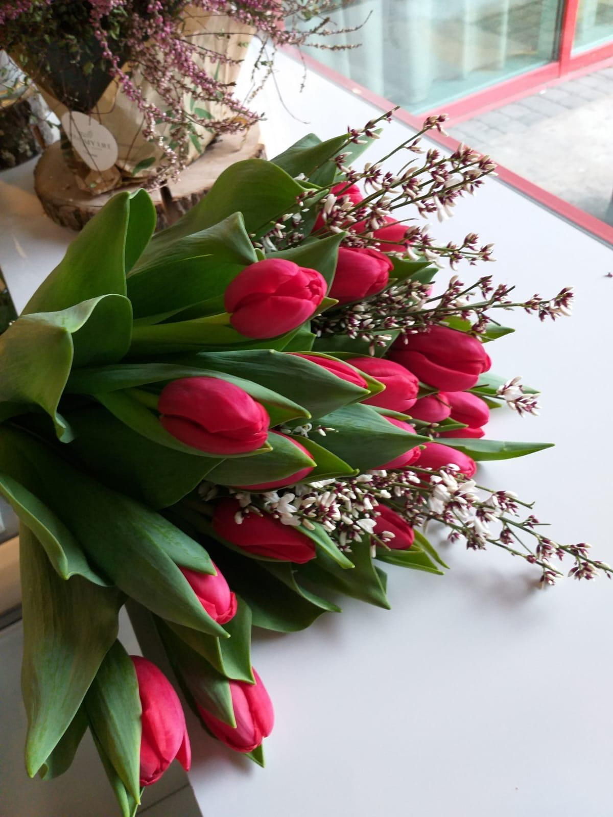 Pušķis, kas sastāvā ir tulpes un smaržīgie genistra ziedi.
