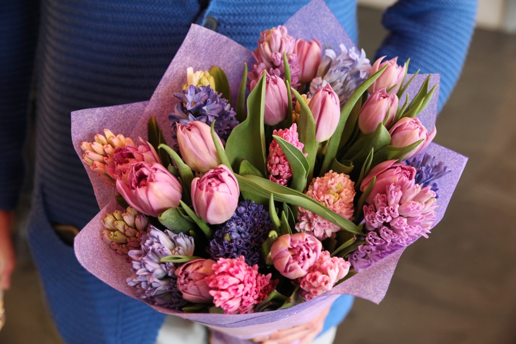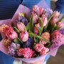 Vidēja izmēra pušķis, kas sastāvā ir tulpes un hiacinti.