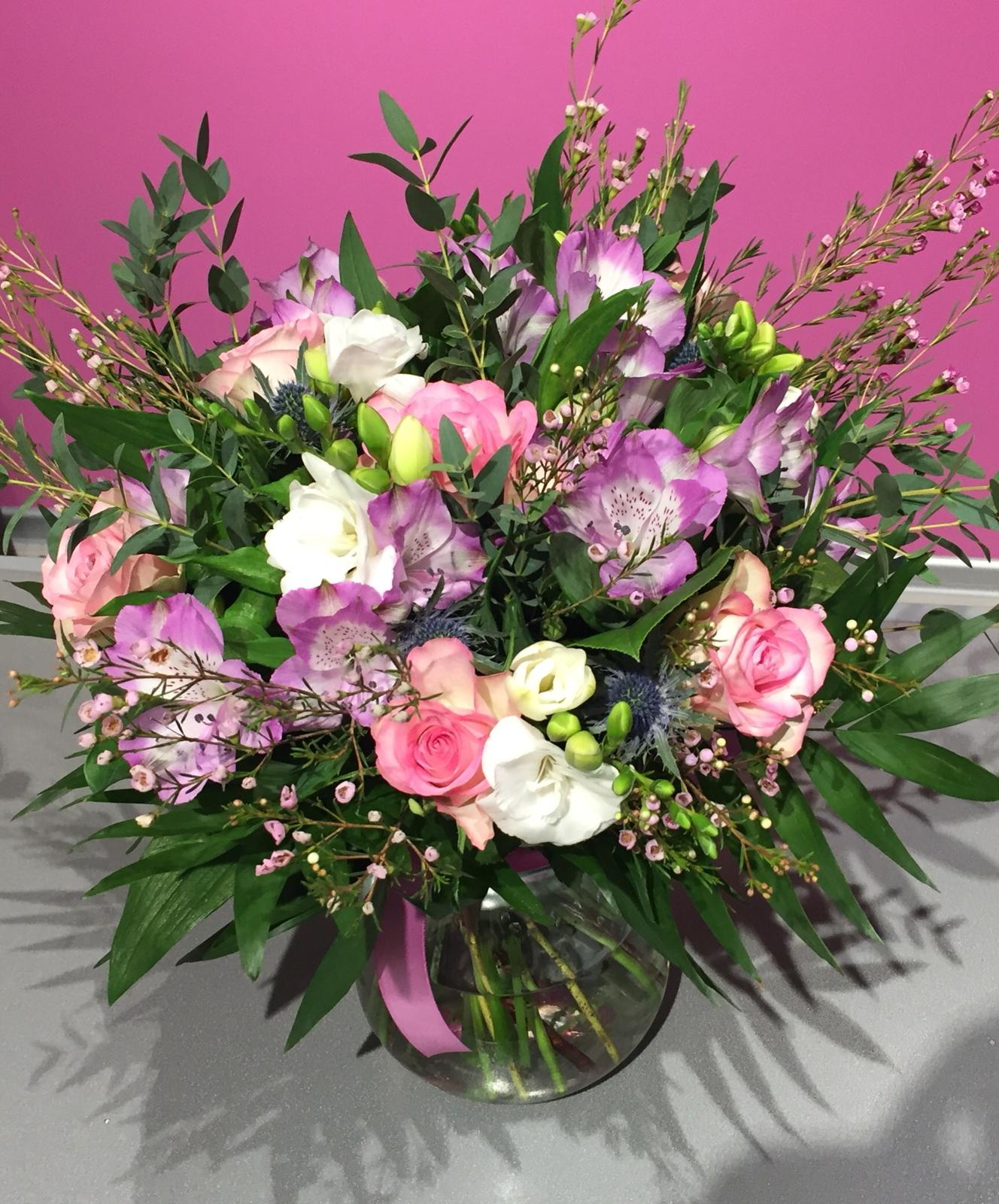 Vidēja izmēra pušķis, kas sastāvā ir alstromerijas, rozes, vaska ziedi, frēzijas, kā arī gaumīgi pievienoti zaļumi. Pušķis ir vidēja blīvuma un tas ir apsiets ar dekoratīvo lentīti.