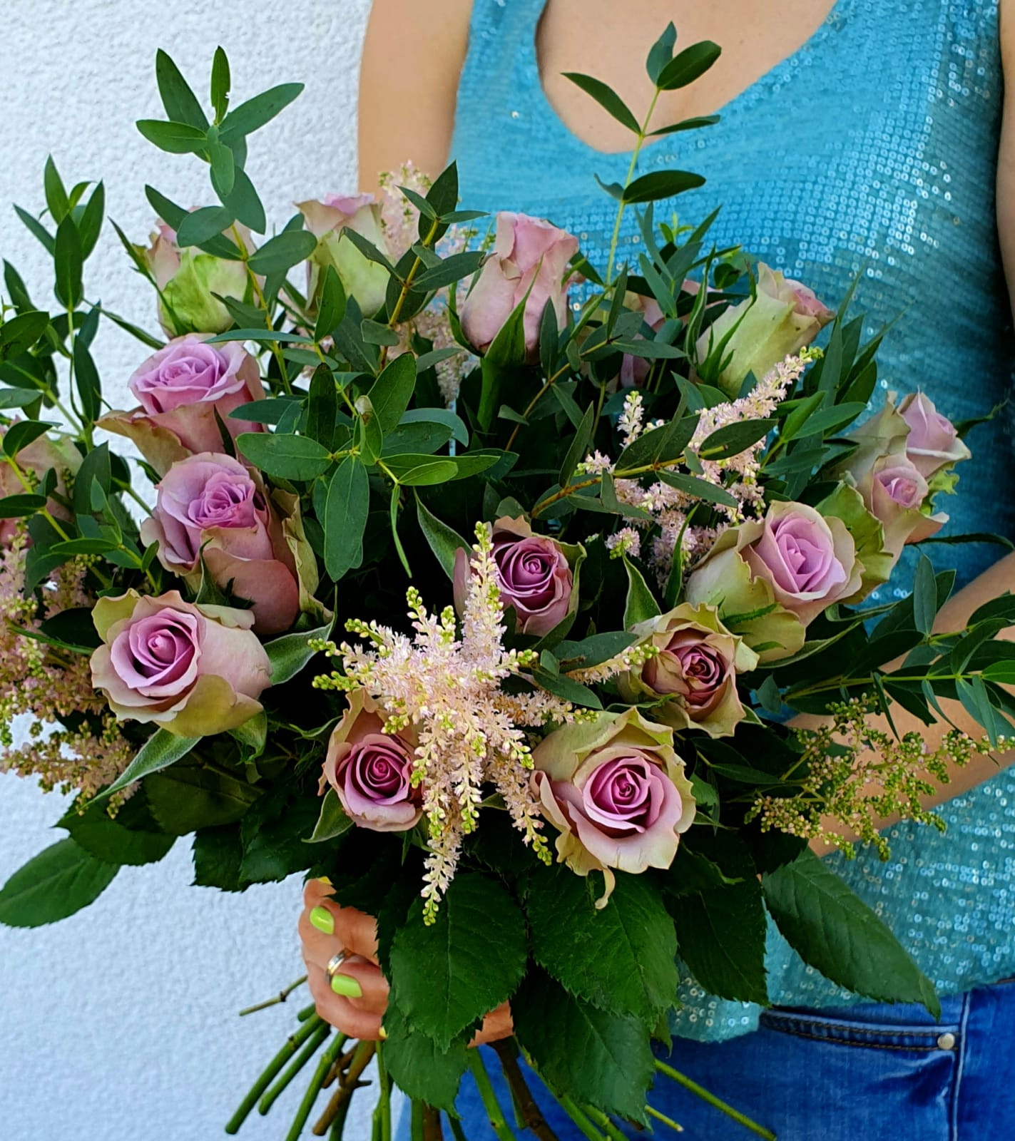 Vidēja izmēra pušķis, kas sastāvā ir rozes, astilbes un eikalipta zaļumi.