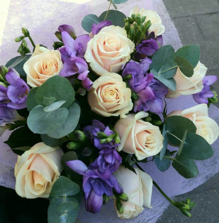 Pušķis, kas sastāvā ir rozes, frēzijas un eikalipta zaļumi.